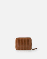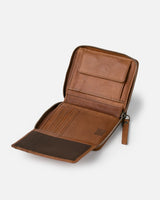 Portefeuille en cuir de vache lavé et tanné. Fermeture zip, compartiments pour billets, cartes et pièces.